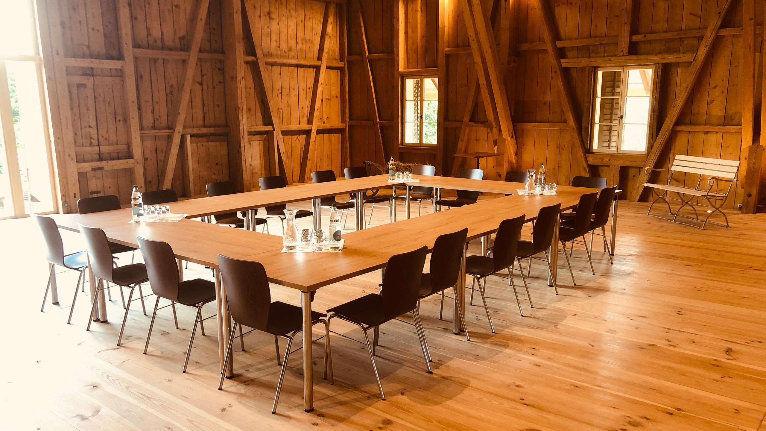 In einem anmutigen Weiler im thurgauischen Hüttwilen wurde eine 150-jährige Scheune mit viel Liebe zum Detail in eine moderne Tagungslocation umgebaut. Ins alte Scheunentor wurden Glasfenster eingebaut, die einen wunderbaren Blick direkt in die Natur und in die umliegende Landschaft ermöglichen. Es duftet nach Holz und an einem Cheminee können Kamingespräche geführt werden. Auf Wunsch begleitet Sie der Besitzer raus ins Grüne und macht eine interessante Führung durch die Obst- und Rebanlagen, die man mit einem Apéro im Rebberg abschliessen kann.