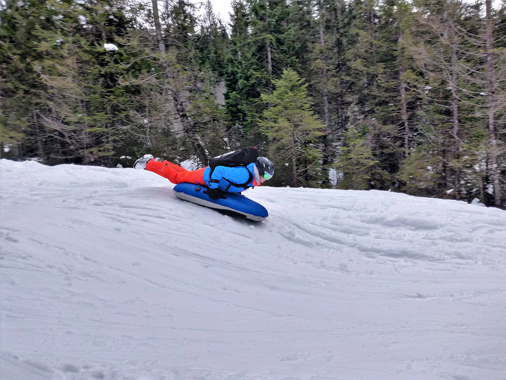 Geführte Snow-Bodyboard Touren sind ein besonders Erlebnis. Ausgerüstet mit Schneeschuhen und Teleskopstöcken geht es mit einem erfahrenen Guide bergauf. Das Bodyboard ist klein und leicht im Rucksack verstaut. Oben angekommen, wird es aufgepumpt und dient als Sitzkissen für den Zvieri, oder für ein Sonnenbad. Vor der Abfahrt werden die Schneeschuhe und Stöcke im Rucksack verstaut und nach der Instruktion durch den Guide gibt's den unvergleichlichen Flug über dem Pulverschnee. Ideal für ein kleines Team bis 10 Personen.