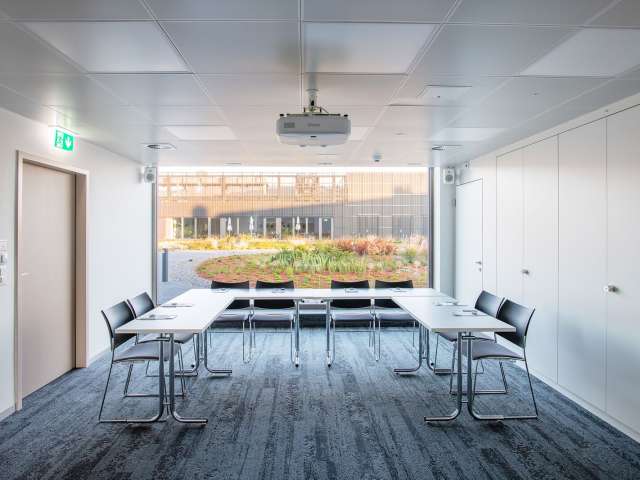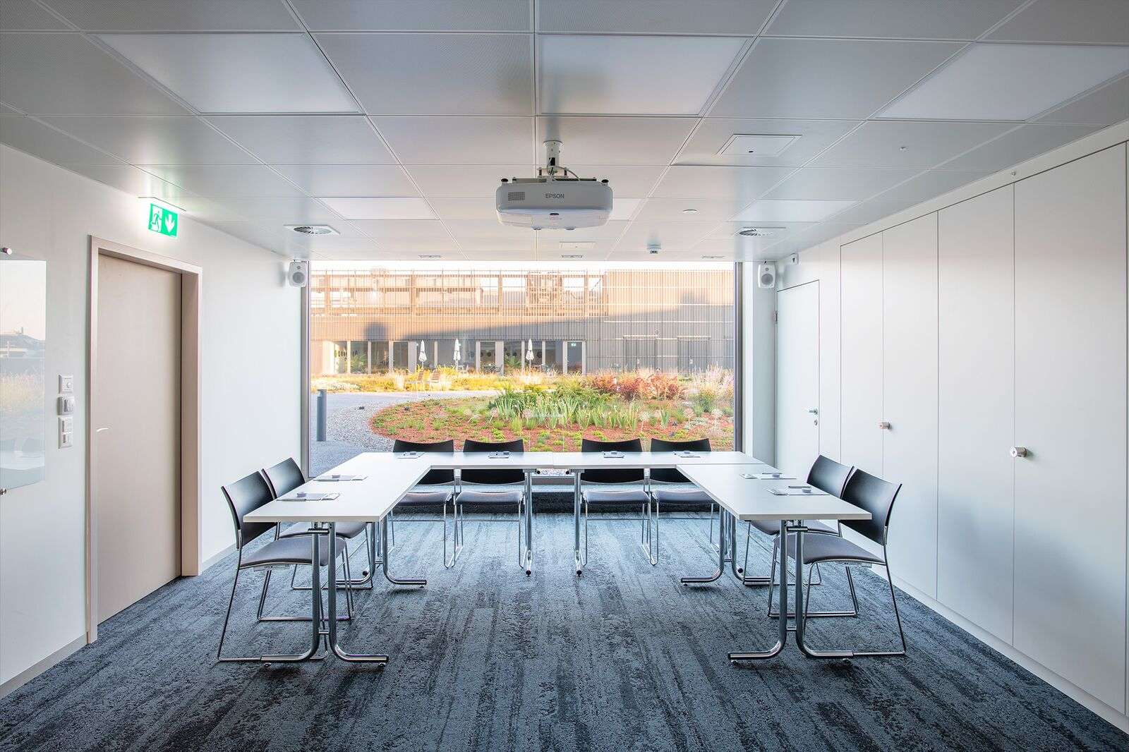 - Ein multifunktionaler Konferenzraum (60 m²), flexibel teilbar in zwei lichtdurchflutete Räume, ausgestattet mit modernster Standardtechnik