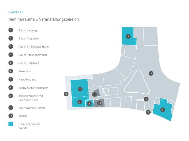 Fünf Räume stehen zur Verfügung. Vom privaten 18 m2 grossen Sitzungszimmer bis hin zu einem Saal mit 120 m2. Alle Seminarräume verfügen über Tageslicht, modernste Tagungstechnik und schöne Ausblicke in die Natur und über den Bodensee. Stilvolles Ambiente und modernes Design schaffen den Rahmen für wertschöpfende Seminare. In einem harmonischen Arrangement aus exklusivem Spa und kulinarischer Freude können Seminarteilnehmer Gedanken austauschen und konzentriert arbeiten. Gut zu erreichen mit Auto und ÖV.